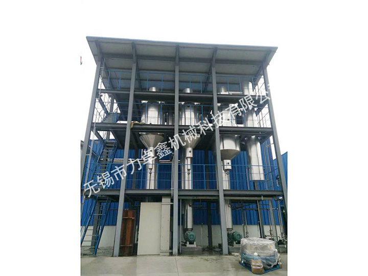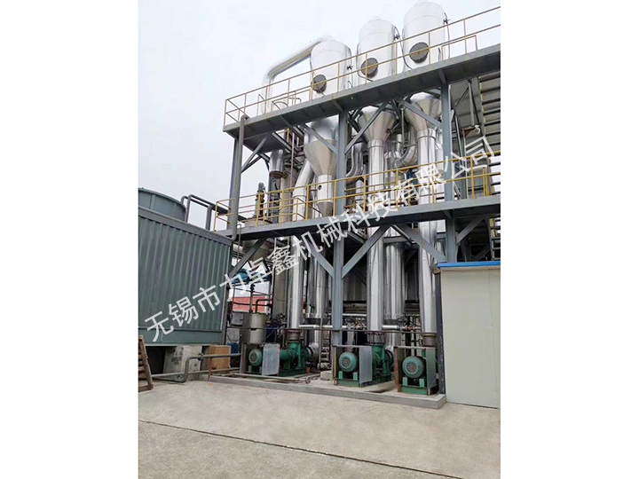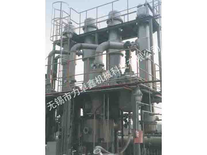 工作原理:四效降膜蒸發(fā)器需濃縮的料液由泵送入加熱管頂部,沿著加熱管內壁形成液膜向下流動。在這個過程中,由于管外的加熱,管內液膜開始沸騰并部分蒸發(fā)